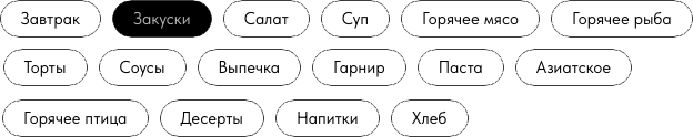 16 разделов: завтраки, обеды, ужины, соусы, десерты и тд